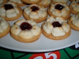 S připravených surovin uděláme těsto. V ruce uděláme kuličky,do kuliček malý důlek.Do důlu marmeládu a kousek ořechů.Pečeme na 150 stupňů.Při peční se těsto jak kdyby vysušuje....