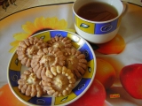 Cukr, žloutky, máslo a kakao dohromady utřeme, přidáváme mouku, ořechy a vanilkový cukr. Toto zpracujeme do hladka, potom vložíme do lisu na těsto. Protlačujeme hmotu,děláme kytičky, které umístíme na plech, kde je pečící papír. Když jsou sušenky hotové t...