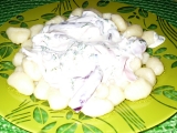 Brambory oloupeme a nakrájíme na tenké plátky. Vsypeme je do osolené vroucí vody, krátce povaříme, scedíme a necháme okapat. Cibulky nebo porek očistíme, cibuli oloupeme, vše nasekáme nadrobno a promícháme je s bramborami, asi třemi lžícemi smetany a sušenou ...