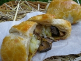 Nakrájenou cibuli a slaninu zpěníme na oleji,přidáme houby,sůl,pepř,petrželku a podusíme asi 10min.Pak přidáme vařené brambory,které vidličkou rozmačkáme na větší kusy a smícháme s houbami. Na pomoučeném vále rozválíme list.těsto a rozkrájíme na 8 ...