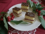 Těsto: Vejce ušleháme s cukrem, pak přidáme ostatní suroviny. Upečeme na vymazaném a vysypaném plechu. Krém: Z mléka a prášku uvaříme pudink a do vlažného zašleháme máslo, cukr a zakysanou smetanu. Natřeme na upečený piškot a pocákáme čokoládovou polev...