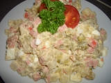 Brambory uvaříme ve slupce a oloupeme. Necháme vychladnout a nakrájíme na kostičky, (lze použít i spec. kolečko s drátky) vložíme do mísy a přidáme na kostky nakrájený salám, nakrájenou okurku, cibuli, vařenou mrkev, hrášek, přidáme majonézu, ocet, cukr (...