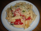 Recept na Těstoviny s kuřecím masem, cuketou a rajčaty |