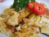 Uvaříme těstoviny a zvlášt oloupané a na kolečka nakrájené brambory do poloměkka. Uzené maso popřípadě překrájíme. připravíme si zálivku: Cibule na kostičky dáme do kastrůlku na rozpálený olej (aby byla cibule pokryta olejem) a necháme zpěnit, poté za...
