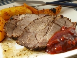Nejprve připravíme marinádu ze všech uvedených surovin kromě římského kmínu, ten nejprve zlehka opečeme na pánvi, aby se rozvoněl. Pak přidáme i ten. Maso nakrájíme na silnější plátky,cca 3cm, a napícháme je těsně vedle sebe řeznou plochou nahoru. Osol...