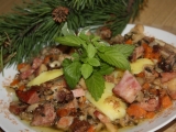 6 velkých cibulí nakrájíme na plátky, stejně nakrájíme kořenovou zeleninu - celer, petržel, mrkev a ředkvičky. Na kostky nakrájíme vepřovou plec, uzený bok, klobásu a slaninu. Přidáme petrželovou a celerovou nať, česnek nakrájený na plátky, zalijeme oleje...