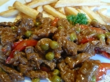 Na nudličky nakrájené maso zprudka orestujeme, opepříme, podlijeme vývarem a pod pokličkou dusíme cca 20 minut. Přidáme na nudličky nakrájené papriky, feferonku, cibuli na céčka a oloupaná, na měsíčky nakrájená rajčata. 5-10 minut zarestujeme a dosolíme. ...