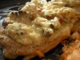 Na olej oloupete 5 cibulí, pokryjete dno většího pekáče a na ni vložíte 4 naklepané kotlety. Zasypete je 300 g nahrubo nastrouhaného tvrdého sýra, mírně popepříte, posolíte a zalijete 1/4 l šlehačky. Pekáček vložíte do předehřáté trouby a zapékáte zhr...