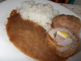 Maso řádně rozklepeme, osolíme a opepříme. Z jedné strany pomažeme hořčicí (plnotučnou nebo dijon- záleží na Vaší chuti) a poklademe 1/4 vařeného vajíčka, kouskem okurky, plátkem cibule a špalíčkem anglické slaniny. Zabalíme a zajistíme (zde to je o ne...