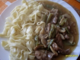 Na oleji osmažíme maso, které jsme si předem nakrájeli na velmi tenké nudličky. Osolíme a opepříme, chvíli podusíme a pak přidáme žampiony. Promícháme a přilejeme větší lečo i ze šťávou a menší bez šťávy. Přidáme nahrubo nasekaný česnek, zalej...