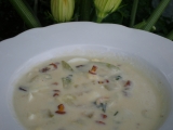 Usmažíme si světlou cibulovou jíšku, přilijeme trochu studeného uzeného vývaru a rozmícháme, aby se nevytvořily hrudky. Pak přidáme na hranolky nakrájenou cuketu, osolíme a dusíme. Cuketa musí zůstat pevná. Podle potřeby doléváme vývar. Nakonec dáme proh...